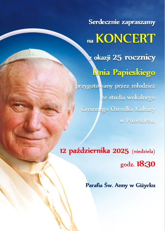 Z okazji Dnia Papieskiego, w przyszłą niedzielę po Mszy wieczornej odbędzie się Koncert z okazji 25 Dnia Papieskiego przygotowany przez młodzież ze studia wokalnego Gminnego Ośrodka Kultury w Pozezdrzu.