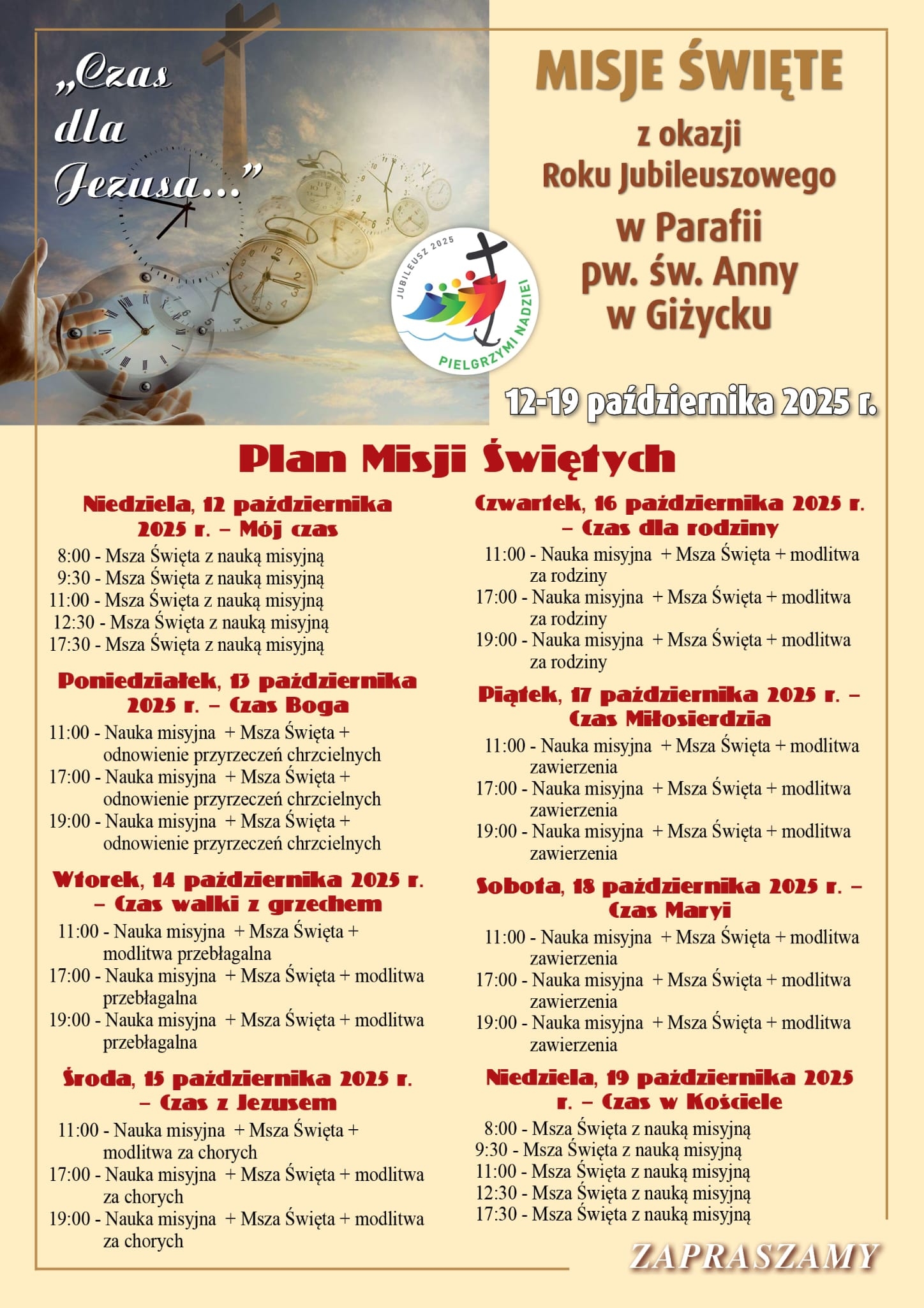 11. Parafia Św. Maksymiliana Kolbe w Giżycku organizuje czterodniową pielgrzymkę na Dolny Śląsk, po drodze sanktuaria w Toruniu, Licheniu i Kaliszu, w dniach 14-17 października. Więcej informacji na plakacie w gablocie.